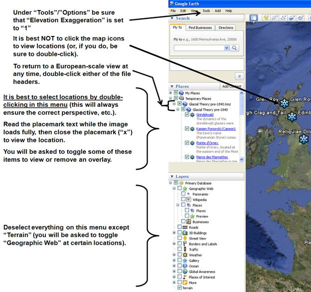 "If this [glacial] theory be correct, and the facility with which it explains so many phenomena which have hitherto been deemed inexplicable, induces me to believe that it is; then it must follow that there has been . . . a fall of temperature far below that which prevails in our days” (Louis Agassiz, 1837, p.377). In the 1840s geologists faced the possibility that the Earth was once very cold, with Europe covered in glaciers. Evidence supported both accepting and rejecting this idea. This case study allows you ro address the evidence of the time and decide for yourself. In the process, you should learn a bit about Earth's history, how scientists interpret evidence, and also how science is shaped by personality, cultural context and lively debate. To experience the life of a 19th-century geologist well, you need to travel and visit significant sites around Europe. Here you will do this using Google Earth ( the "Tour") -- see below for set-up. You will also read about how those observations were interpreted through original publications from the 1800s (the "Episodes"). This background will allow you to address the provocative theory first presented by Louis Agassiz and William Buckland at the Geological Society of London in 1840: that thick ice sheets once covered the land! Two tracks are available: